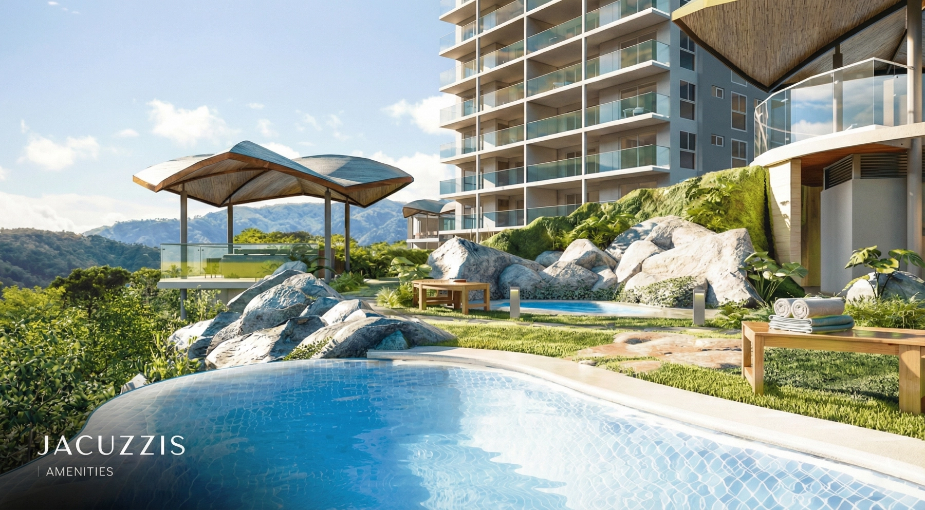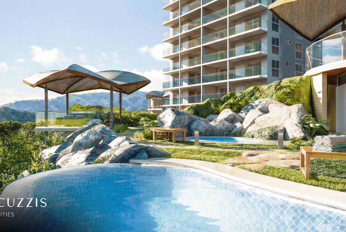 Perched on the prestigious ridge near the iconic Villa Caletas Hotel, this brand-new 3-bedroom residence in the exclusive Mar a Mar development offers the perfect balance of luxury and tranquility. Located on the coveted “North Face” of the building, Unit 02-1A is shielded from highway noise, offering peaceful immersion in the jungle canopy and sweeping views toward Punta Leona and the Gulf of Nicoya.